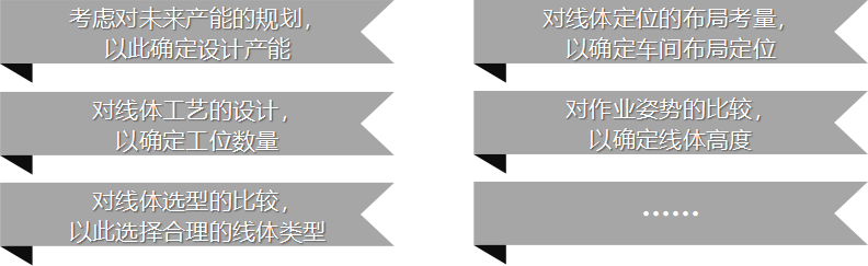在線體規劃設計項目中,我們會充分考慮對未來產能的規劃,以此確定設計產能;對線體工藝的設計,以確定工位數量;對線體選型的比較,以此選擇合理的線體類型;對線體定位的布局考量,以確定車間布局定位