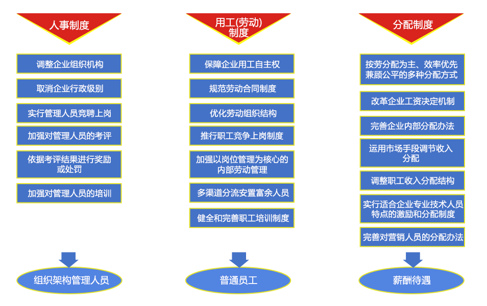 從當(dāng)前各地國資國企改革實踐來看,三項制度改革成為了推進國企改革的重點突破口,是加快企業(yè)改革步伐重要抓手。三項制度改革和核心主要建立人員能進能出(勞動)、干部能上能下(人事)、工資能高能低(分配)的現(xiàn)代企業(yè)制度,提升國有企業(yè)用人體制機制的市場化水平,建立分層分類、業(yè)績導(dǎo)向、差異化安排的長效激勵機制,優(yōu)化企業(yè)組織架構(gòu),提升國有企業(yè)經(jīng)營水平。