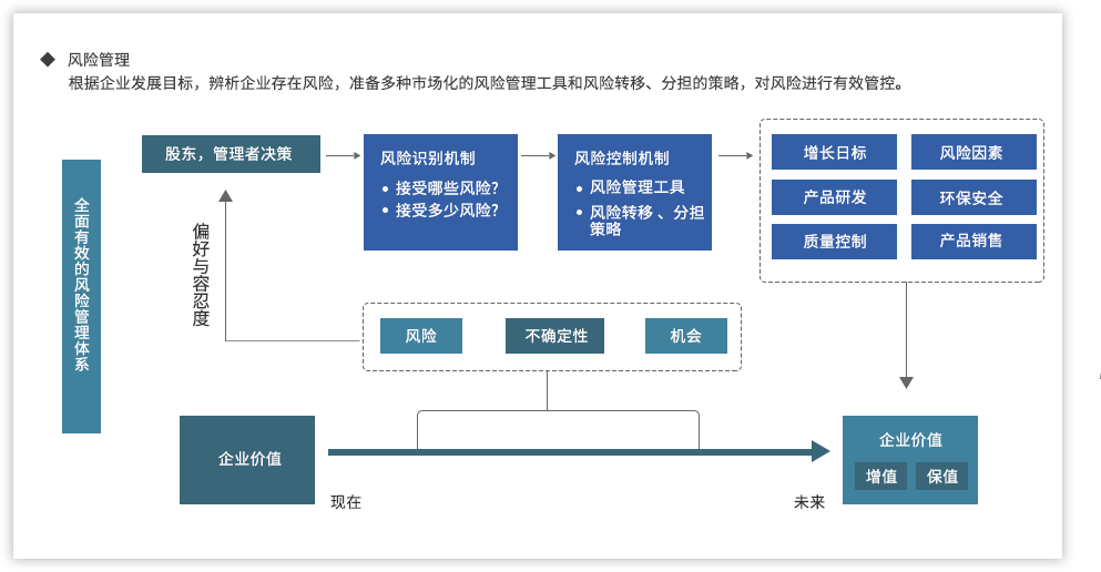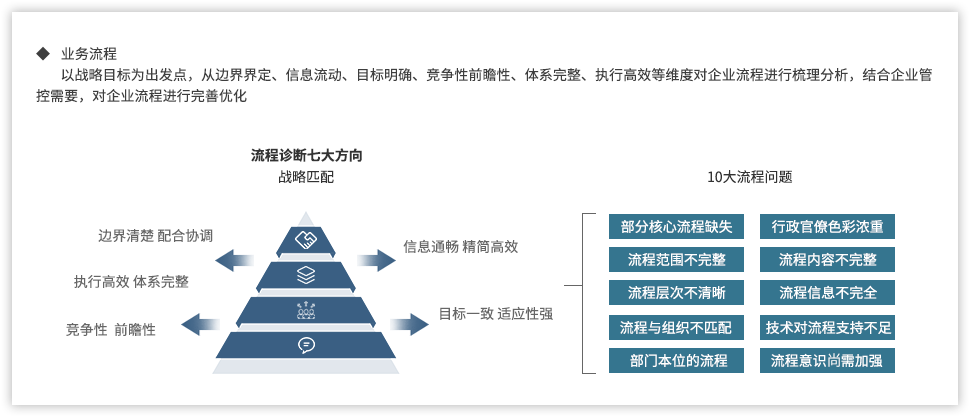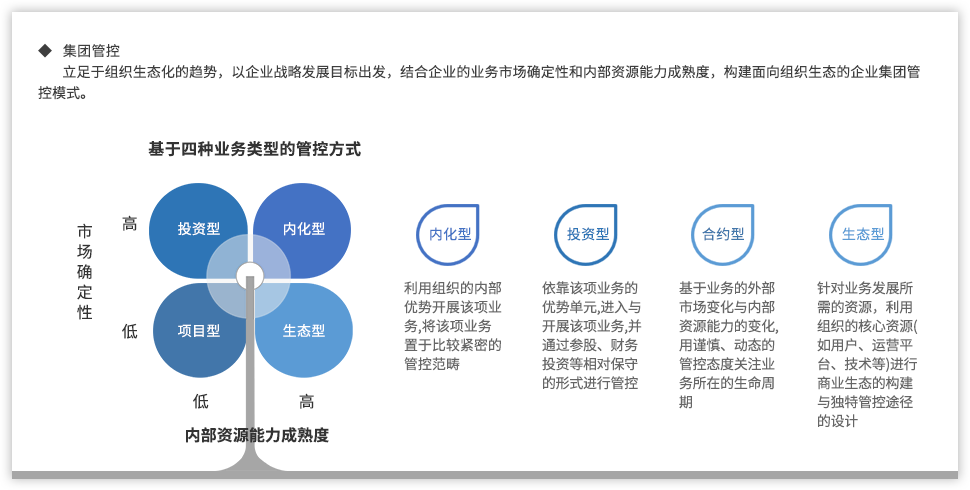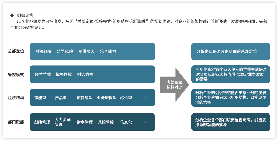 遠(yuǎn)大方略認(rèn)為,為了強(qiáng)化國(guó)有企業(yè)組織管控能力,企業(yè)需要以戰(zhàn)略發(fā)展目標(biāo)為出發(fā)點(diǎn),從組織架構(gòu)、集團(tuán)管控、業(yè)務(wù)流程、風(fēng)險(xiǎn)管理、財(cái)務(wù)管控等各個(gè)方面進(jìn)行全面提升,構(gòu)建系統(tǒng)全面的管控體系。