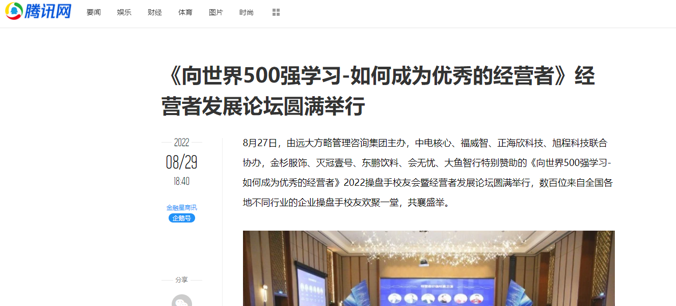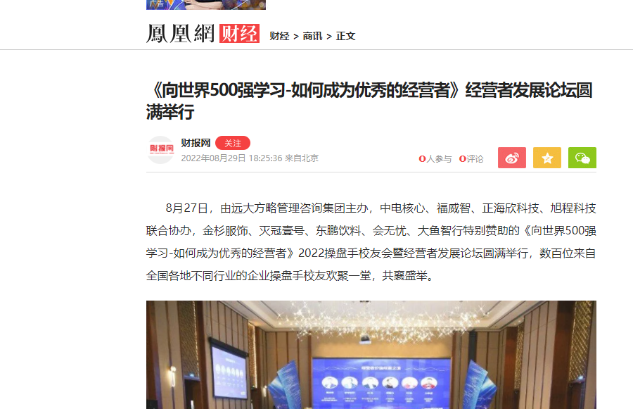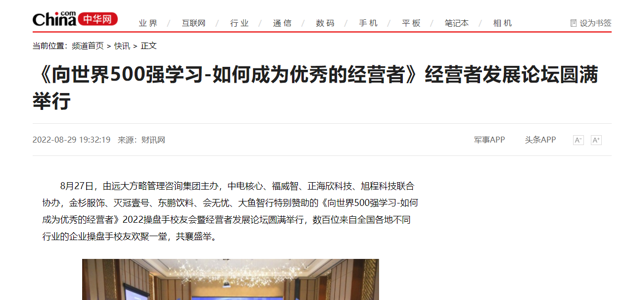 8月27日,由遠(yuǎn)大方略管理咨詢集團(tuán)主辦,中電核心、福威智、正海欣科技、旭程科技聯(lián)合協(xié)辦,金杉服飾、滅冠壹號(hào)、東鵬飲料、會(huì)無憂、大魚智行特別贊助的《向世界500強(qiáng)學(xué)習(xí)-如何成為優(yōu)秀的經(jīng)營(yíng)者》2022操盤手校友會(huì)暨經(jīng)營(yíng)者發(fā)展論壇圓滿舉行,數(shù)百位來自全國(guó)各地不同行業(yè)的企業(yè)操盤手校友歡聚一堂,共襄盛舉。