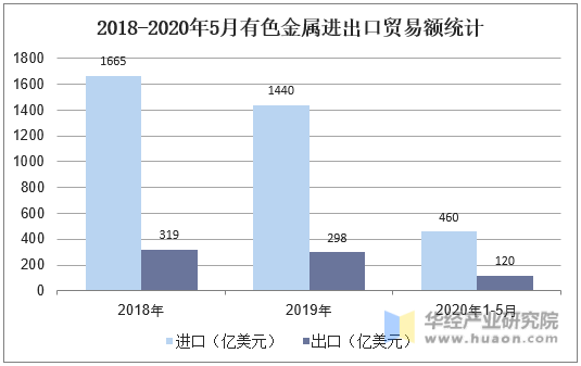 2018-2020年5月有色金屬進出口貿易額統計
