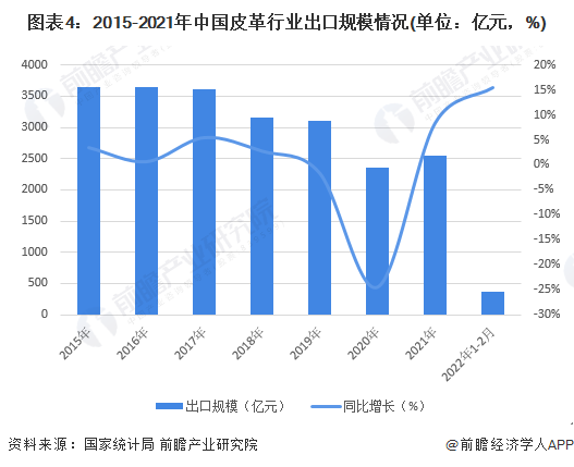 我國是全球皮革制造行業主要的生產地和出口地,2015-2018年,全國皮革出口規模逐年增長;2019年受到中美貿易摩擦的影響,有小幅下降;2020年受新冠疫情的影響,全國皮革行業出口總額同比下降超過20%;2021年皮革出口市場逐漸回溫,全年皮革產品出口總額超過2500億元,同比增長超過8%。