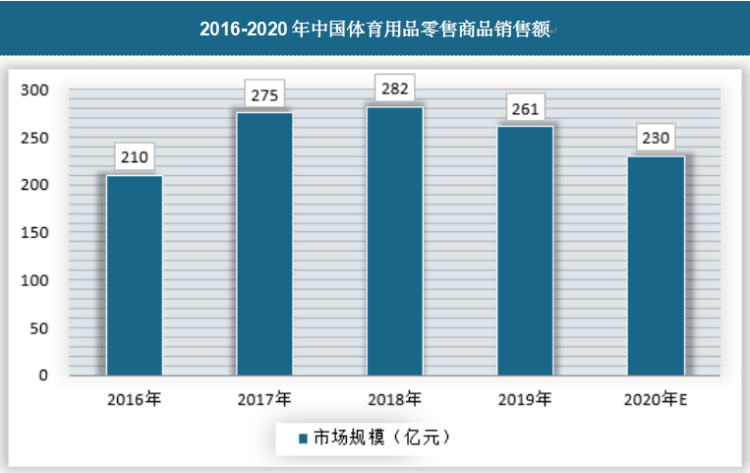隨著政策利好、人民體育消費需求的提高,我國體育用品行業的發展將進入新時期。體育品牌分別針對消費者的不同需求類型,拓展專項的運動用品市場,例如兒童、女性運動用品等。而跑步作為一項大眾體育運動,近幾年跑步類產品更是需求增長迅猛。2016-2018年中國體育用品零售商品銷售額逐年增加,2019年中國體育用品零售商品銷售額達到261億元。新冠肺炎疫情對我國體育用品行業造成一定的影響,人們參與相關戶外體育活動的大幅降低。預計2020年中國體育用品零售商品銷售額將達到230億元左右,具體如下: