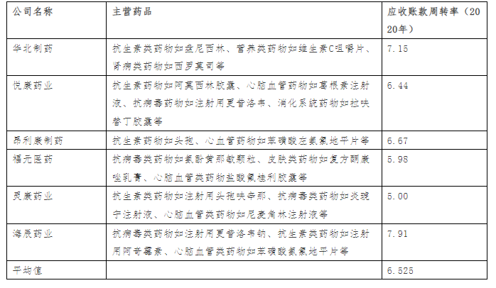 醫藥制造企業普遍存在應收賬款較大的現象,原因是其下游客戶公立醫院等較為強勢。另經對比研究上市公司2020年公開數據,得出結論醫藥制造行業平均應收賬款周轉率一般在5-7之間(按產品細分領域不同可能存在一定差異)。