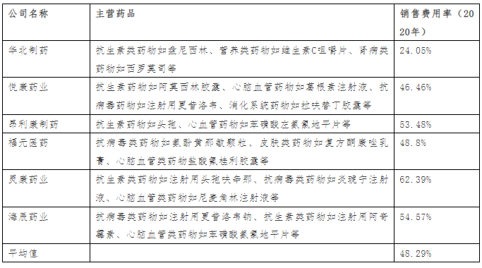 在醫藥制造行業中營銷極為重要,由于兩票制政策的出臺,目前大部分藥品的營銷費用都由藥企承擔,并通過業務推廣費體現。經對比研究上市公司2020年公開數據,得出結論醫藥制造行業平均銷售費用率(銷售費用/營業收入)在40%-60%之間(按產品細分領域不同可能存在一定差異)。