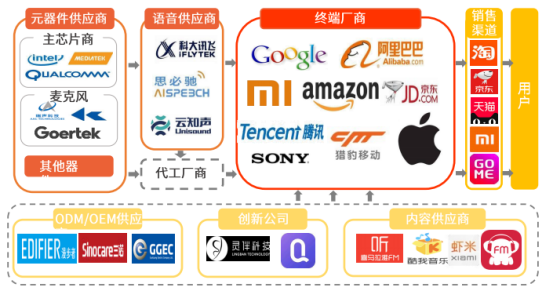 智能音箱方案主要由聲智科技、先聲互聯、摩爾聲學等公司提供,包括語音識別、麥克風陣列、硬件方案設計等多方面設計。智能音箱芯片主要由聯發科、Amlogic、全志科技等芯片廠商生產,其中聯發科已占據Echo過半的芯片份額,目前多數芯片兼容多個平臺和網絡協議。富士康、國光電器、漫步者、奮達科技等ODM公司為多個品牌代工??傮w而言,智能音箱產業鏈中,國產品牌占據較大的份額,而國產智能音箱多選用國產元器件品牌以控制成本。而在產品低價促銷的驅使下,高技術成熟度、低成本生產是供應鏈廠商共同努力的方向。