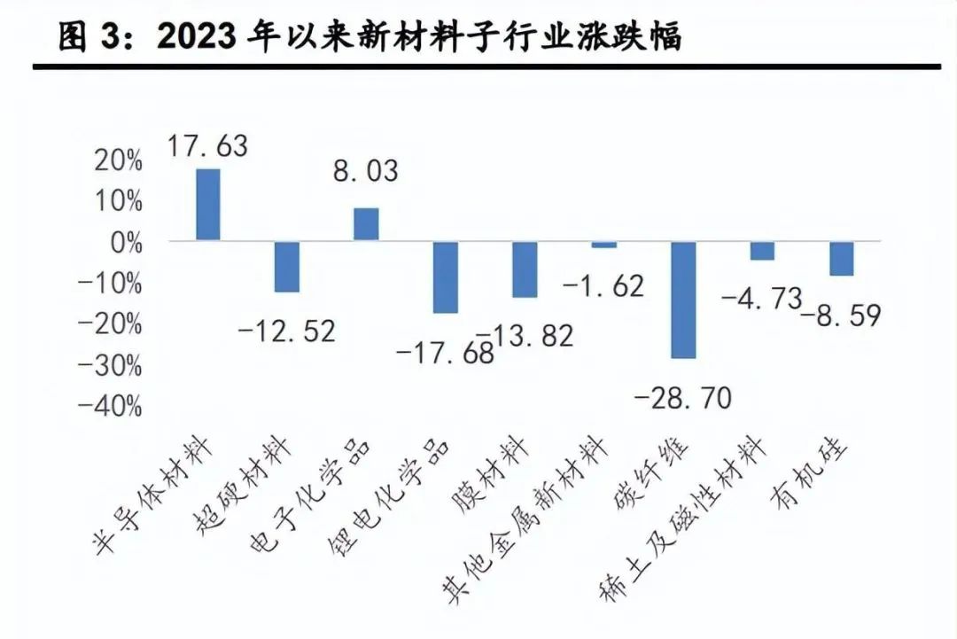 根據工信部《新材料產業發展指南》,新材料主要包括先進基礎材料、關鍵戰略材料、前沿新材料三大類。由于尚未有較為統一和明確的新材料子行業劃分標準。因此,我們根據《新材 料產業發展指南》,選取有機硅等行業代表先進基礎材料板塊,選取半導體材料、 超硬材料、電子化學品、鋰電化學品、膜材料、碳纖維、稀土及磁性材料等行業代表關鍵戰略材料;選取公司主營業務以金屬增材制造材料為主的其他金屬新材料行業代表前沿新材料,共同組成新材料子板塊。