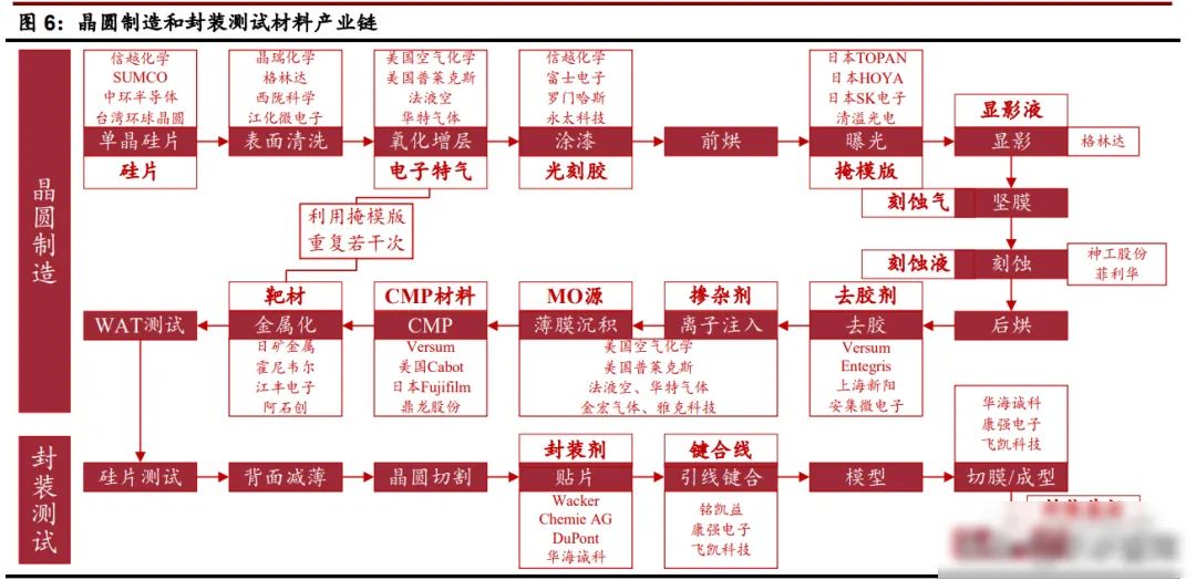 半導體材料貫穿了半導體制造的整個流程,包括了芯片制造和芯片封裝所使用的材料。芯片制造用半導體材料主要包括硅片、光刻膠、電子濕化學品、高純電子特氣、CMP 材料、靶材、 石英制品等;封裝用半導體材料主要包括封裝基板、引線框架、陶瓷封裝材料、鍵合絲、包裝 材料、芯片粘結材料等。根據 SEMI,半導體硅片占比最大,其次是電子特氣和光掩模。從整體來看,半導體細分材料行業眾多,各個細分材料市場規模較小。