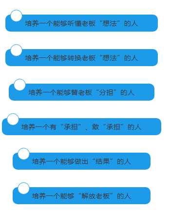 讓老板走出去,花更多的時(shí)間去研究市場、研究產(chǎn)品方向。讓操盤手具有自主經(jīng)營意識(shí)思維的人,不管老板在與不在公司,都能讓企業(yè)正常運(yùn)營,推動(dòng)處理跨部門的事情;為將來企業(yè)做大做好準(zhǔn)備;使公司戰(zhàn)略可真正的落地執(zhí)行。通過訓(xùn)練,提升操盤手解決問題的能力、系統(tǒng)思維能力與實(shí)戰(zhàn)運(yùn)營能力。