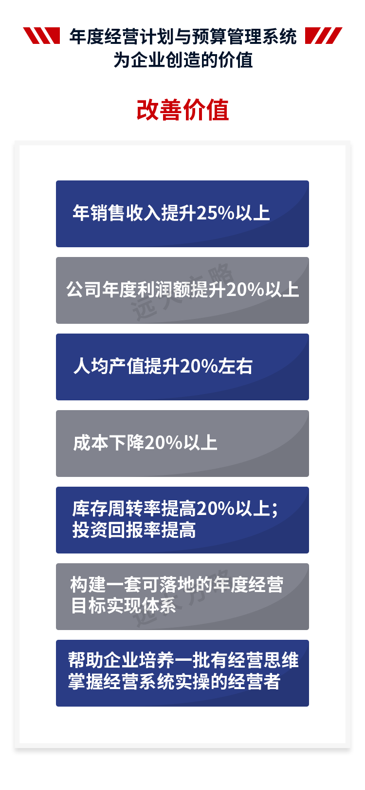 遠大方略始終遵循不了解不理解企業(yè)的前提下絕不輕易下結(jié)論,正式制定改善方案前必須深入到業(yè)務(wù)一線了解和理解企業(yè)的運營情況。