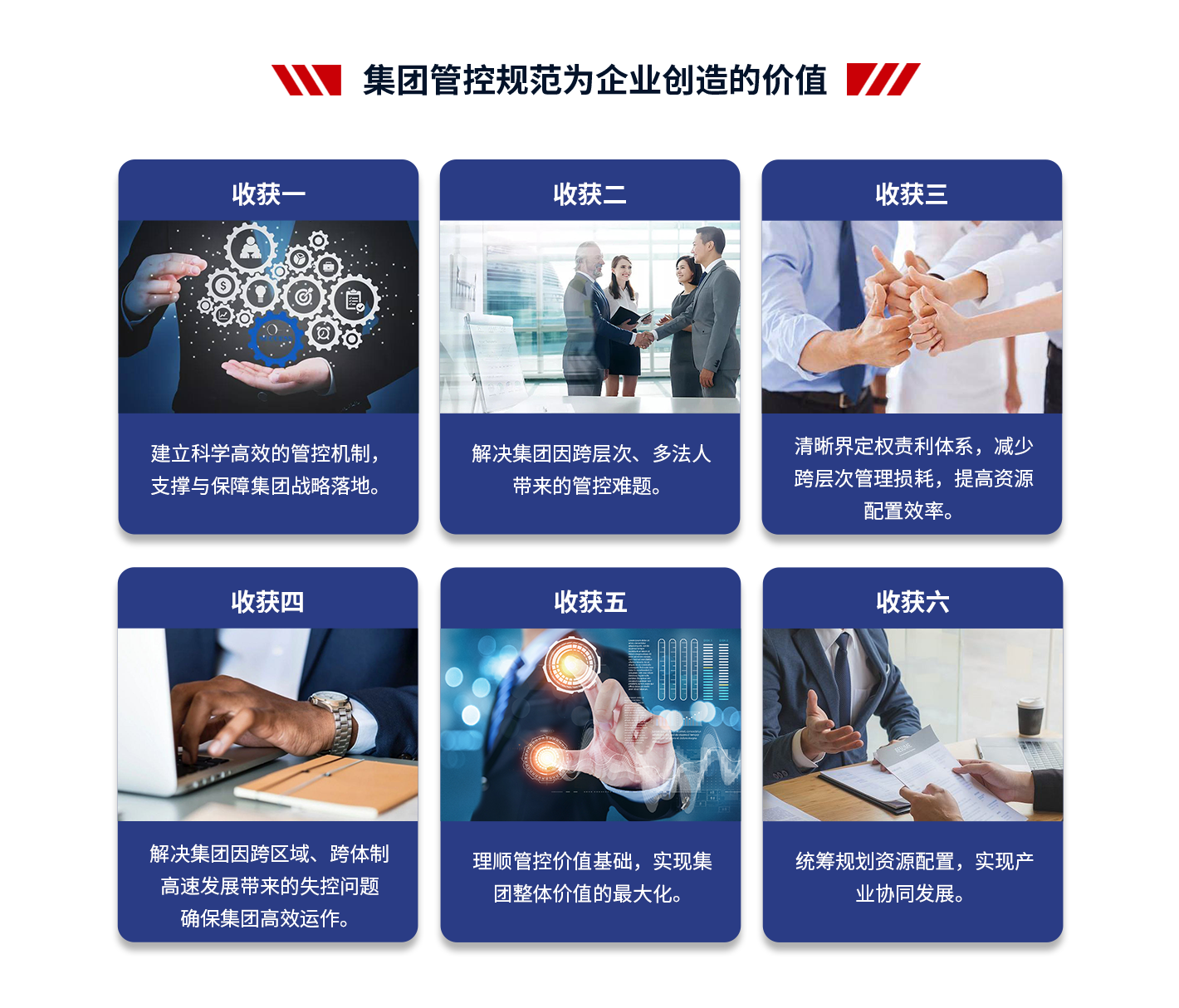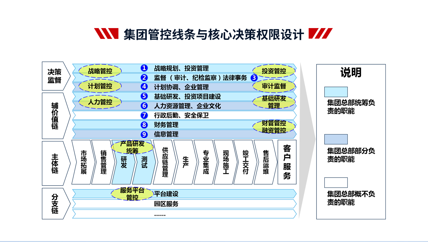 4、項(xiàng)目成果:支撐集團(tuán)戰(zhàn)略落地,提高集團(tuán)整體的運(yùn)營效率;減少因跨層次管理帶來的損耗,提高集團(tuán)內(nèi)部資源配置效率;建立一套廣譜、可復(fù)制的管控模式;解決集團(tuán)因跨區(qū)域、跨體制、高速發(fā)展帶來的失控問題,確保集團(tuán)高效運(yùn)作;理順管控價(jià)值基礎(chǔ),實(shí)現(xiàn)集團(tuán)整體價(jià)值的最大化;打造強(qiáng)勢總部,解決集團(tuán)總部空心化、文職化等問題。